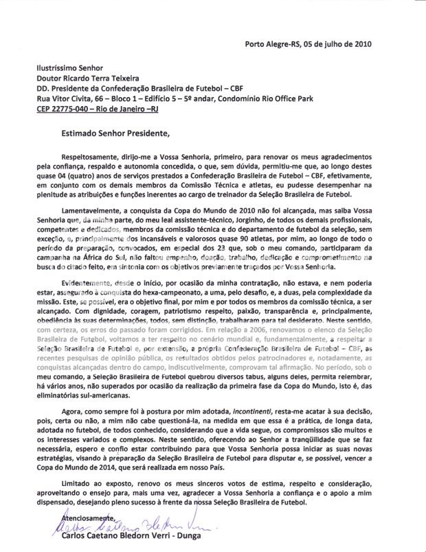 Confira aqui na íntegra a carta enviada por Dunga ao presidente da CBF [Confederação Brasileira de Futebol] Ricardo Teixeira.